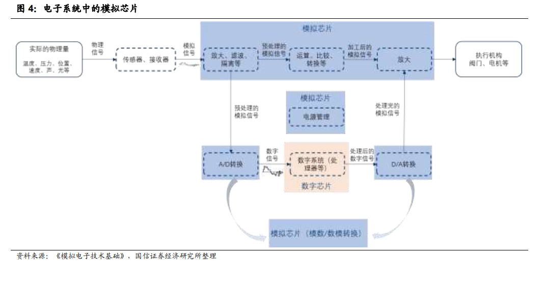 虽然数字芯片的市场规模远大于模拟芯片,但模拟芯片在电子系统中是不可或缺的。自然界的真实信号通过传感器提取后变为模拟信号,模拟信号需要经由模拟芯片处理后才能被数字芯片使用。由于传感器、接收器实际提供的信号很微弱,噪声大且易受干扰,所以一般需要进行信号的预处理,包括放大、滤波、隔离等。预处理完成后再进行加工,包括运算、比较、转换等,加工完的信号一般不足以驱动负载,所以还需要进行功率放大。如果信号需要进行数字化处理,则将预处理后的模拟信号通过 A/D 转换器转为数字信号,处理完后再通过D/A 转换器转为模拟信号。可见,模拟芯片是电子系统中不可或缺的一部分。