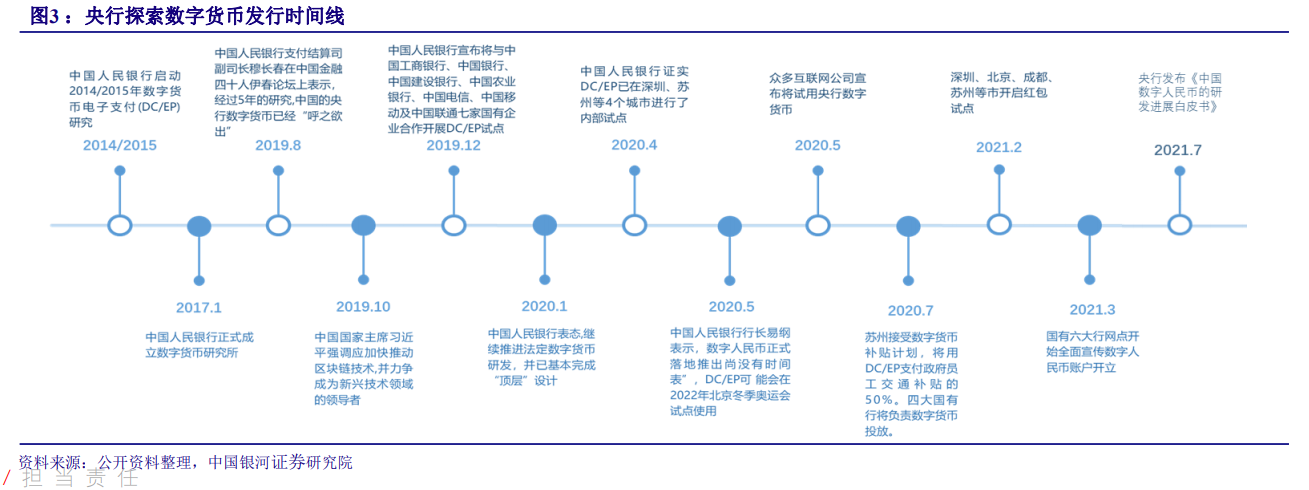 中国人民银行是世界上最早积极投身对央行数字货币进行研究的中央银行之一。2014年,央行及其下属组织的成员陆续开始了关于数字货币的研究,2017年初央行正式成立数字货币研究所。2019年8月,穆长春副司长表示央行数字货币已经“呼之欲出”了。同年12月,央行宣布将与四大行合作完成数字人民币试点阶段。2020年4月,央行证实数字人民币已在深圳、苏州等4个城市进行了内部试点;同期,农业银行发布了一款移动端支付测试应用。2020年5月,易纲表示,央行尚无制定发行数字人民币的时间表,可能会在2022年北京冬季奥运会试点使用。2021年7月,央行发布《中国数字人民币研究发展白皮书》