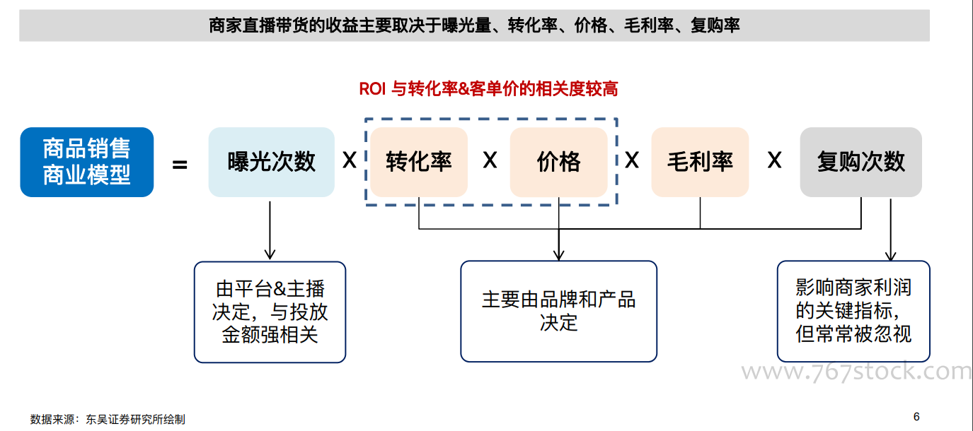 直播效果更取决于品牌和商家,主播&平台主要决定曝光次数。商品销售商业模型 = 曝光次数*转化率*价格*毛利率*复购次数,其中转化率、价格、毛利率、复购率等因素,都主要由品牌和商品本身所决定。我们认为,直播并不能改变品牌特性,而仅能帮助品牌增加曝光;要想通过直播打造爆品,需要产品/品牌具备相应的内功。