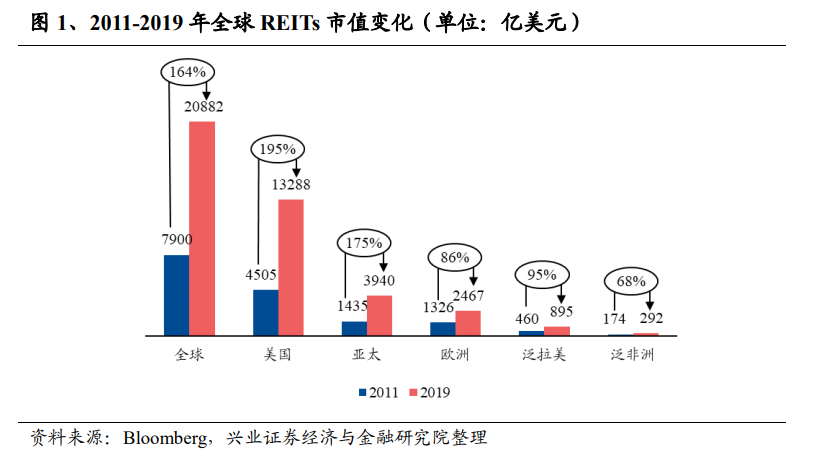 全球 REITs 发展逾 60 年,应用遍布成熟及新兴市场。REITs 于 1960 年起源于美国房地产市场,随后拓展至不同行业和不同国家及地区,当前在美国、日本、澳大利亚等发达地区以及泰国、印度等新兴市场均得到快速发展。近年来美国及亚太市场快速增长,显著拉动整体。市场格局逐步趋于“强者恒强”。2011-2019 年全球 RETIs 市值从 7900 亿美元大幅增长 164%至 2.09 万亿美元,同期美国、亚太、欧洲、泛拉美、泛非洲市场涨幅分别为 195%、175%、86%、95%、68%,涨幅与市值规模大致呈现正相关性,判断市场逐步显露马太效应,即在应用越成熟的市场,REITs 模式越得到社会认可,从而进一步获得政策推动、新产品上市和估值提升。