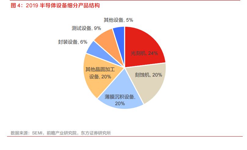 IC 制造设备占半导体设备比例达 80%,光刻、刻蚀和沉积设备为主要组成部分。从产品细分结构来看,目前供应的半导体设备主要为 IC制造设备,其占市面上半导体设备的比重约为 80%;在这些 IC 制造设备中,以光刻机、刻蚀机和薄膜沉积设备为主,根据 SEMI 测算数据,当前这三类半导体设备分别约占市面上半导体设备的 24%、20%和 20%。