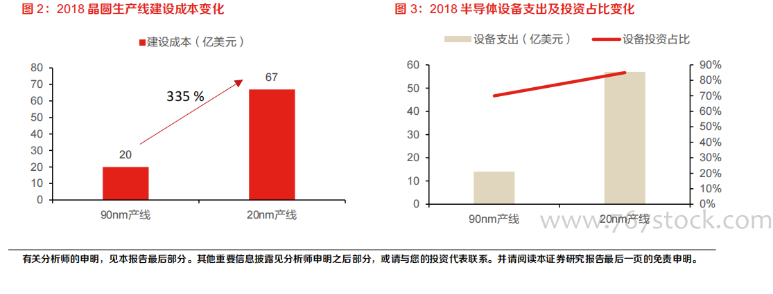 先进制程驱动产线建设成本上行,半导体设备资本支出占比提升。通常,一条 90nm 制程芯片的晶圆生产线建设成本为 20 亿美元,当制程微缩至 20nm 时成本达到 67 亿美元,翻了三倍之多。而半导体设备作为半导体产线投资的主要投入项,不仅种类繁多,而且具有非常高的技术要求,也导致设备的价格非常昂贵,设备在生产线的资本支出占比也逐渐提高。根据高新智库研究表明,在 90nm 制程中设备支出占比为 70%,到了 20nm 制程占比达到 85%,从 14 亿美元提高到 57 亿美元,提高了约 4 倍。