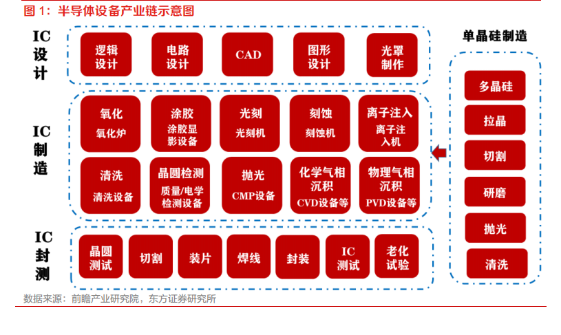 半导体设备在硅片制造、前道及后道工艺中举足轻重。半导体设备即主要应用于半导体制造和封测流程的设备。半导体设备行业是半导体制造的基石,是半导体行业的基础和核心。从产业链来看,半导体设备的上游主要是单晶硅片制造以及 IC 设计,下游则主要为 IC 封测。根据半导体设备在 IC 制造中应用的场景不同,一般可以分为氧化炉、涂胶显影设备、光刻机、刻蚀机、离子注入机、清洗设备、质量/电学检测设备、CMP 设备、CVD 设备和 PVD 设备等。