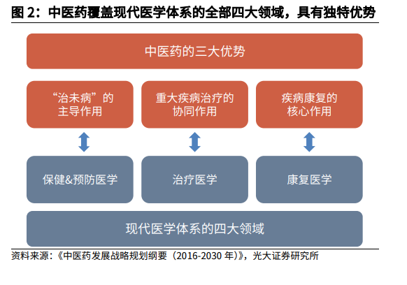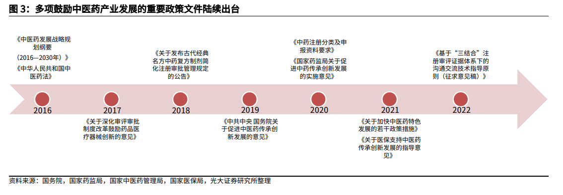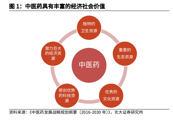 发展中医药已上升为国家战略,政策推动中医药产业高质量发展。十八大以来党中央、国务院高度重视中医药产业发展,出台多项鼓励政策。2016 年 2 月《中医药发展战略规划纲要(2016-2030 年)》这一纲领性文件的出台,标志着发展中医药正式上升为国家战略,明确了我国中医药发展的方向和工作重点。2017年 7 月首部《中华人民共和国中医药法》正式实施,为促进中医药事业发展奠定了法律依据。2019 年 10 月后《中共中央 国务院关于促进中医药传承创新发展的意见》、《关于加快中医药特色发展的若干政策措施》等一系列政策文件,逐步构建起中医药高质量发展的制度体系,切实保障和促进了中医药事业的发展。习近平总书记也多次强调“要遵循中医药发展规律,传承精华,守正创新”、“推动中医药和西医药相互补充、协调发展”。