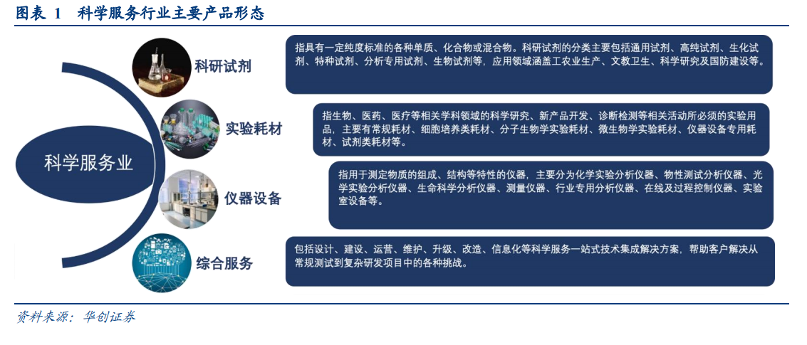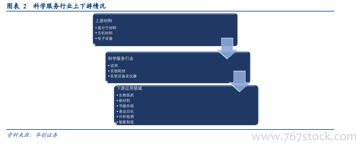 科学服务业涵盖领域广泛,细分领域众多。科学服务行业上游材料主要为高分子材料、无机材料以及各类电子部件、机电设备等;下游应用主要可分为三类:第一类是各类科研机构部门,如化学实验室、应用测试等专业科学研究机构;第二类是从属于高校院所的各类实验室,用来进行教学和科研工作;第三类为创新型企业,其建立实验室从事科学研究、分析检测工作,保障企业的技术研发及质控,涉及领域包括生物医药、新材料、新能源、节能环保、食品日化、分析检测、智能制造等。