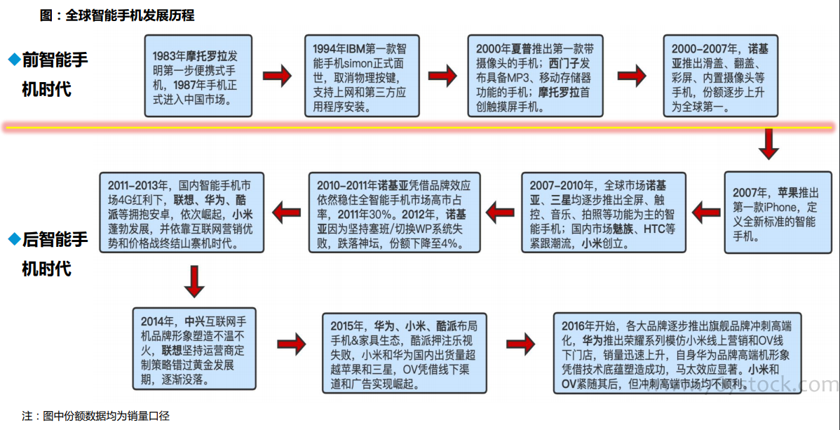 具体各时代代表品牌维度:摩托罗拉开创移动手机时代先河,诺基亚接棒摩托罗拉凭借品牌壁垒和系统优势以及持续更新迭代的多样化机型成为前智能手机时代王者;苹果推出iPhone标志市场进入后智能手机时代,三星小米、OV、华为先后崛起,接棒以中华酷联为代表的时代,主导全球智能手机市场。