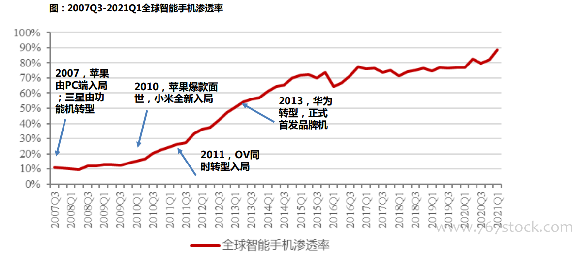 回看智能手机行业渗透率以及公司关键时间节点:1)苹果站在全球智能手机行业爆发的起点,渗透率为10%左右(2017年),从软件和硬件的角度,定义何为“智能手机”;2)三星站在全球智能手机行业爆发的起点,以硬件持续迭代升级+供应链高度垂直整合时刻对标苹果,持续跟随;3)小米站在中国智能手机行业爆发的起点,全球渗透率为15%左右(2010年),以创始人的互联网运营思路为核心,定义何为“互联网智能手机”;4)OV站在全球智能手机蓬勃发展前期,渗透率25%左右(2011年),迅速找准自身“拍照/音乐/快充”等特色,并辅以地毯式营销,定义何为“有特色的高性价比智能手机”;5)华为站在全球智能手机增速最快的时期,渗透率50%左右(2013年),以硬核技术为背书,性价比+品牌+营销多维并进,成功介入。