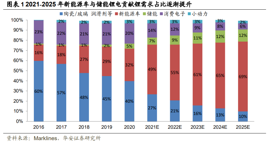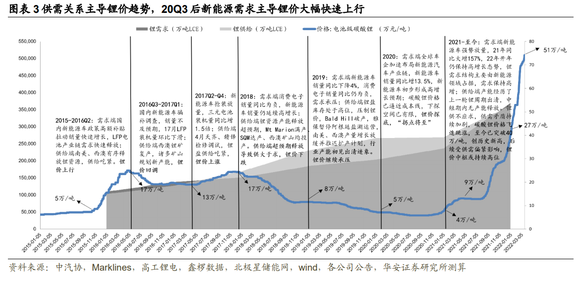 锂价复盘:供需关系主导锂价趋势。锂作为工业金属,历史上呈现较明显的周期性。周期的演变本质上是供需关系导致,是行业下游需求变化与供给产能的出清、释放循环的过程。锂行业历史上两轮大周期主要是下游消费产品应用推动的,分别是 2004-2007 年消费电子驱动的一轮周期和 2015-2020 年新能源汽车发展初期的又一轮周期。而自 2020 年三季度以来,在全球碳达锋碳中和发展新能源的大背景下,新能源车产业链爆发以及未来储能高容量市场需求下,随着锂需求结构和增长逻辑的变化,锂行业将展现出由新能源大发展支撑的强成长性。