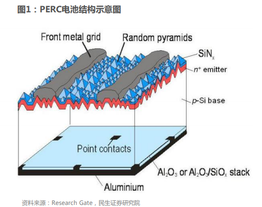 PERC电池金属电极与硅片直接接触,两种材料功函数不匹配,导致接触界面能带弯曲,并产生大量的少子复合,对电池片的转化效率产生负面影响。目前产线效率约23.2%、最高可达23.56%,接近其理论极限24.5%(德国哈梅林太阳能研究所测算)。