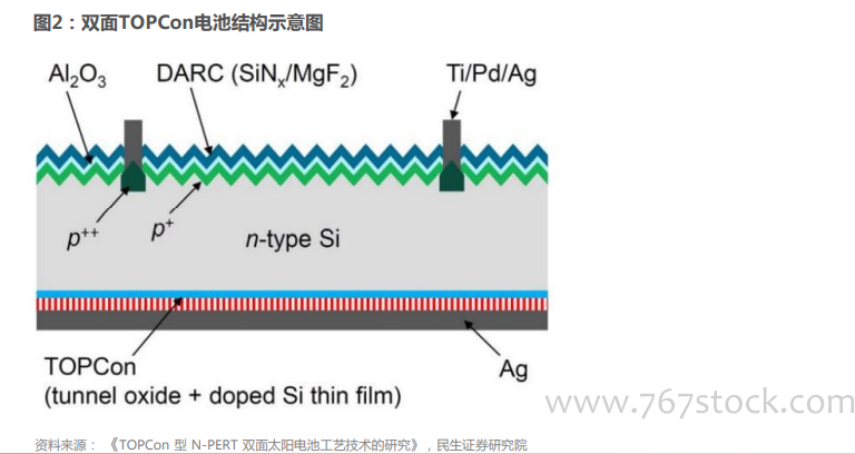 TOPCon:隧穿氧化层钝化接触技术。TOPCon电池是一种基于选择性载流子原理的隧穿氧化层钝化接触(Tunnel Oxide Passivated Contact)太阳能电池技术,其电池结构为N型硅衬底电池,在电池背面结构为:超薄氧化硅+掺杂硅薄层,形成了钝化接触结构,有效降低表面复合和金属接触复合。电池背表面为H型栅线电极,可双面发电。