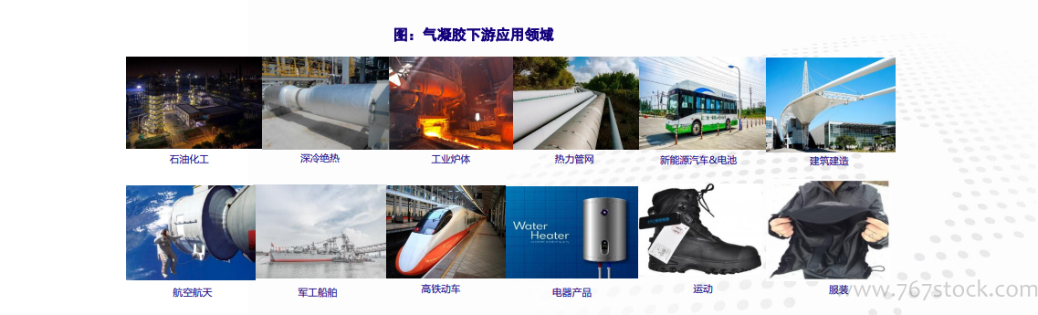 气凝胶下游应用广泛,以隔热保温为主导。由于气凝胶超强隔热等性能,早期主要应用在航天、军工和国防领域,随后逐步扩展至石化、工业、建筑、交通、日用等领域;在电极载体材料、催化材料、传感材料、纳米灭菌材料、药物释放等诸多新兴领域均有广泛研究。目前,气凝胶下游集中在工业管道保温,如油气项目、工业隔热,以及建筑建造隔热等。随着应用领域的不断拓宽,新能源汽车、日用户外等领域市场也将逐渐打开。