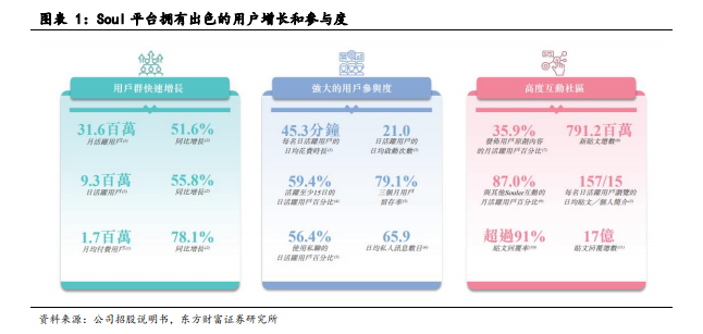 开放式社交产品经历了陌陌、探探以及 Soul 的产品模式演进,呈现出百家齐放的竞争态势。根据艾瑞咨询报告,在中国开放式移动社交网络(即陌生人社交,与“基于线下熟人关系的封闭式社交网络”相对应)中,Soul 拥有最多的私聊功能每名用户日均发送私人讯息数量和最高的每台设备日均启动次数。与国内其他社交网络平台不同,Soul 更加年轻化、基于兴趣图谱而非颜值、去中心化程度高并且以游戏化方式运作。