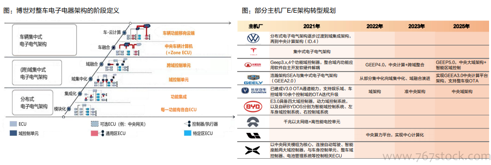 E/E架构集中,自驾域是智能化关键。E/E架构集中化为汽车智能网联化提供硬件基础。传统汽车电子化程度提高是通过不断增加ECU实现,随着汽车功能增长ECU数量逐年增加。由于不同ECU通常来自不同Tier1,因此线束设计、逻辑控制也十分混杂,ECU功能协同困难,系统互斥,数据处理与交互能力受限,限制汽车智能化演进,目前用一个或几个集中式域控制器作为“大脑”来操控全车的ECU与传感器已经成为汽车E/E架构发展共识。博世将整车E/E架构发展分为6个阶段:模块化阶段、功能集成阶段、中央域控制器阶段、跨域融合阶段、车载中央电脑和区域控制器阶段、车载云计算阶段。域集中式的汽车电子电气架构采用域控制器实现对汽车各大功能域进行控制,处于同一域中的功能对应一个域控制器,同域功能间实现协同交互,从基础硬件架构的角度推动实现汽车智能网联化。