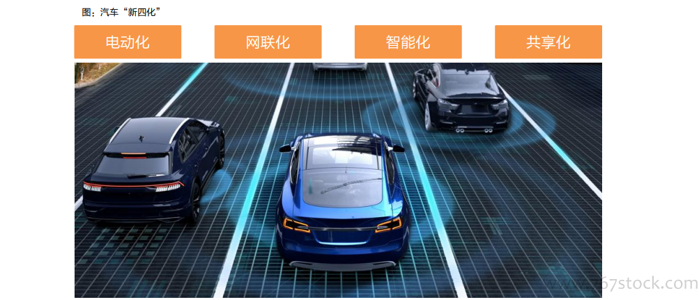 汽车“新四化”进阶。电动化:指新能源动力系统领域,围绕“三电”技术,即电池、电机、电控;网联化:指万物互联、车联网,实现人车路协同; 智能化:围绕智能座舱和自动驾驶,包括座舱的智能交互展示以及车辆自动驾驶;共享化:指新的出行模式,本质在于商业模式创新,包括汽车共享和移动出行。