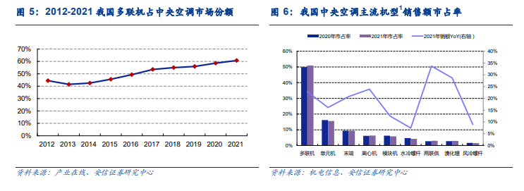 多联机占据中央空调市场半壁江山,单品类规模增速亮眼。1982 年,大金发明世界第一台多联机,开创了楼宇用多联空调系统的新时代。相对于冷水机组,多联机具有设备单价低、高效节能、制冷/制热速度快、安装维护难度低等特点,广泛应用于家居住宅、写字楼等小户型场景。不同的统计口径显示的多联机市场份额存在差异。产业在线数据显示,从 2012 年至 2021 年,我国多联机市场份额提升 16.2pct 至 60.7%。而据机电信息数据,2021 年,我国多联机市场份额为 50.9%。综合两者数据,我们推断,2021 年多联机已占到中央空调市场规模的一半。据产业在线数据,2021 年,我国多联机销售额达到 680.0 亿元,同比增速亮眼,主要因为疫情局势缓和后,消费需求集中释放,且基建投资推动工装项目需求增多。2014 年以来,我国多联机销售规模增速持续优于中央空调行业销售规模增速,体现了多联机品类优秀的增长能力。2012-2021 年,多联机销售额年均复合增长率 14.1%,显著高于中央空调行业增速。