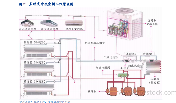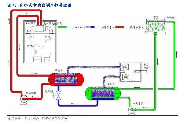 中央空调品类众多,多联机异军突起。中央空调系统是以集中或半集中的方式对空气进行净化(或纯化)、冷却(或加热)、加湿(或除湿)等处理,从而提供生活或生产工艺标准所需环境的一整套空调系统。简单来说,中央空调是由一台主机通过风道或冷热水管连接多个末端的方式,来控制不同房间,以达到室内空气调节目的的空调。中央空调的制冷原理与分体式空调几无差异,但根据不同应用场景对制冷量、温控效果、系统稳定性的要求,中央空调衍生出不同的技术路线。