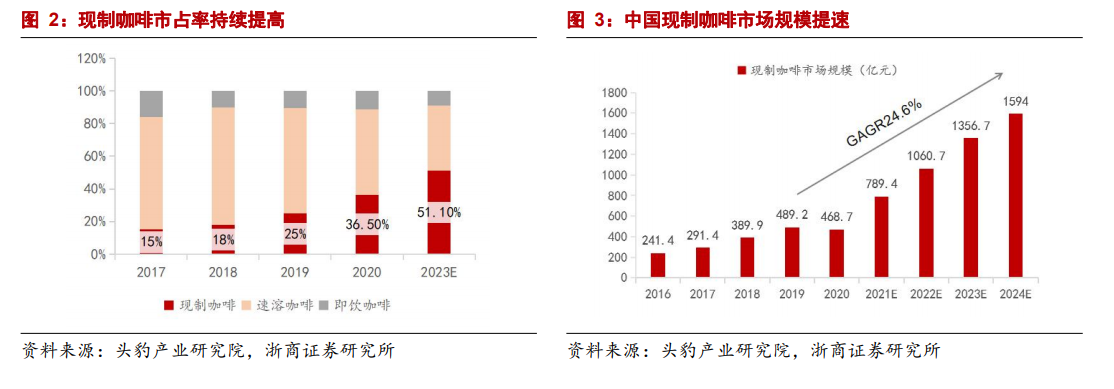 现制咖啡渗透率提升,有望成为市场第一大细分赛道。从品类上看,咖啡共现制、速溶以及即饮三个品类。根据头豹产业研究院数据,2020 年现制咖啡占比 36.5%,速溶咖啡占 52.40%,即饮咖啡占 11.10%,速溶品类仍为当前市场主流,现制咖啡市占率持续提升,预计 2023 年达到 51.1%。市场规模方面,2019-2024 年现制咖啡市场 CAGR 达 24.6%,预计规模从 489.2 亿元增加至 1594 亿元。