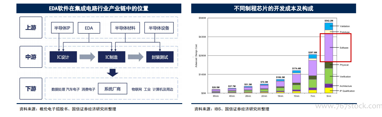 EDA工具是集成电路行业的必备工具,贯穿于IC设计、制造、封测等环节:复杂度上升:单个芯片内部的晶体管数量在“摩尔定律”的推动下每18个月翻一倍,如今5nm的芯片可以容纳125亿个晶体管,未来的3nm芯片将容纳近160亿个晶体管; 产业分工:集成电路产业转向分工模式,从IDM模式转变成“Fabless+Foundry+OSAT”的模式; 设计成本攀升:集成电路设计成本从28nm的5130万美元跃升至7nm芯片的2.98亿美元,5nm芯片的5.42亿美元。