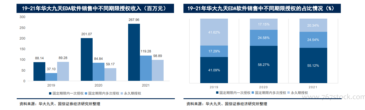 EDA软件的商业模式以1-3年的固定期限授权为主,收入连续性较好。EDA厂商与客户签署期间授权合同,向客户出售EDA相关软件的有限期授权租赁服务,一般合约期为2-3年。根据华大九天的招股书显示,公司的EDA软件盈利模式为授权模式,即公司向客户销售指定版本的软件,并收取合同约定期间的授权费。根据授权期间的不同,又可分为永久期限授权和固定期限授权。客户根据自身业务需求,选择不同期限授权的EDA软件。对软件换代需求不迫切的企业,通常采购永久期限授权软件;对软件换代需求迫切的企业,通常采购固定期限授权软件。公司的固定期限授权通常为1-3年,根据客户自身需求及与公司的协商,合同可约定在固定期限内提供一次或多次授权。多次授权模式下,公司分次向客户提供license,于每次提供license后取得收货(安装)确认单,并确认收入。