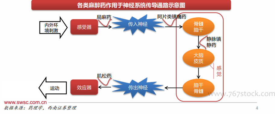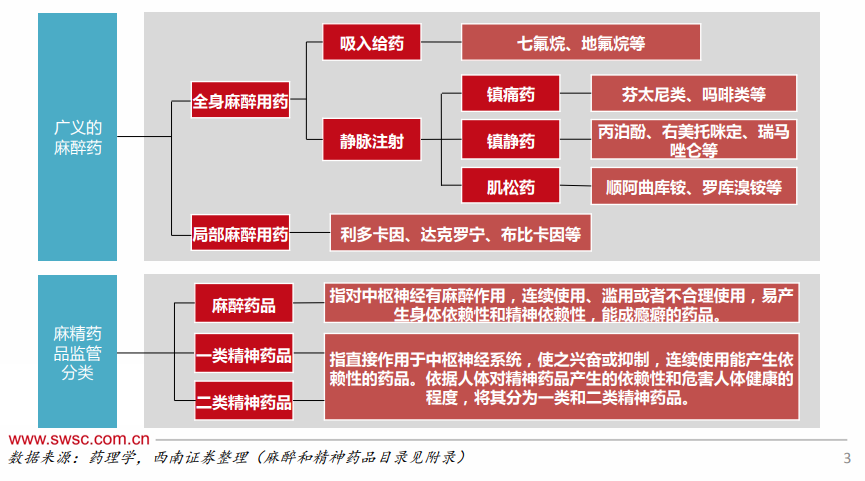 广义的麻醉药是指能使整个机体或局部机体暂时可逆性地失去知觉及痛觉的药物。根据临床用途,可分为全身麻醉和局部麻醉,全身麻醉又可分为吸入给药和静脉注射,其中静脉注射分别为镇痛药、镇静药和肌松药。