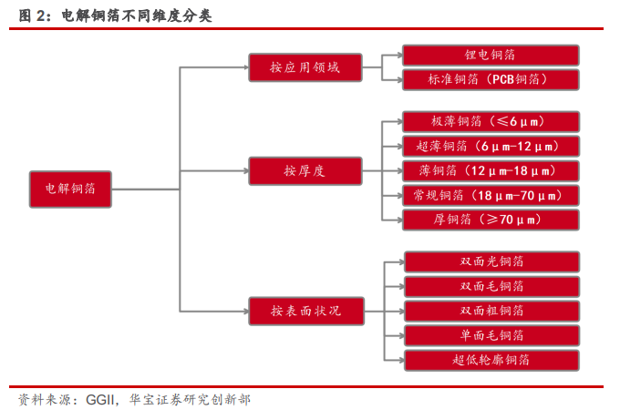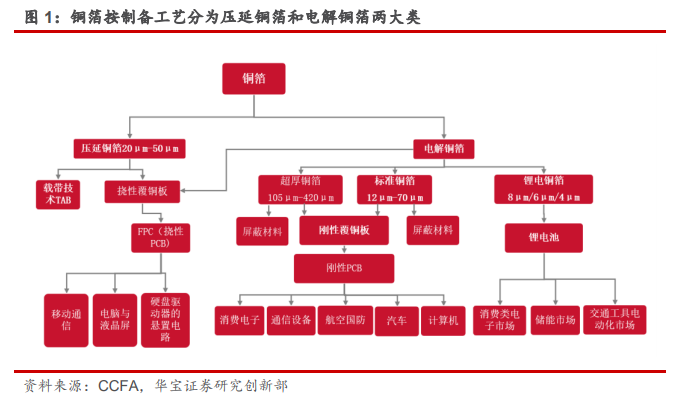 铜箔是厚度在 200μm 以下的极薄铜带或铜片。铜箔并非是传统的金属铜产品,它是结合了复合材料、纳米材料技术等设计理念,加上内部微观组织的不同,导致铜箔的特性不同于传统的纯铜性质。铜箔应用主要着眼于导电、导热、电磁波屏蔽特性。铜箔按制备工艺分为压延铜箔和电解铜箔两大类。