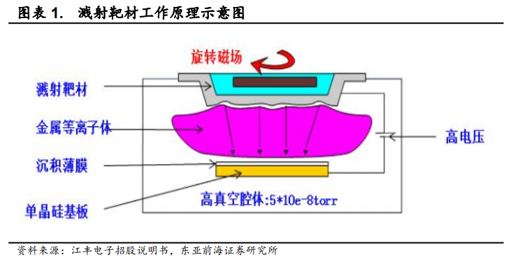 溅射靶材是薄膜制备的主要原材料。在制造集成电路的过程中需要用到溅射工艺,目前物理气相沉积(PVD)技术是制备电子薄膜材料主要技术之一。其工作原理如下:利用离子源产生的离子,在高真空中经过加速聚集,从而形成高速度能的离子束流,进而轰击靶材的表面,离子和靶材表面的原子离开靶材并沉积在基底表面。