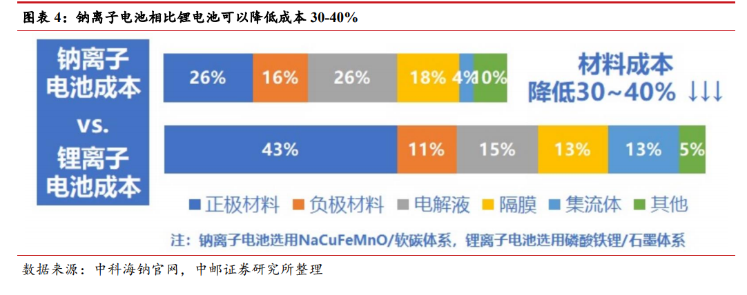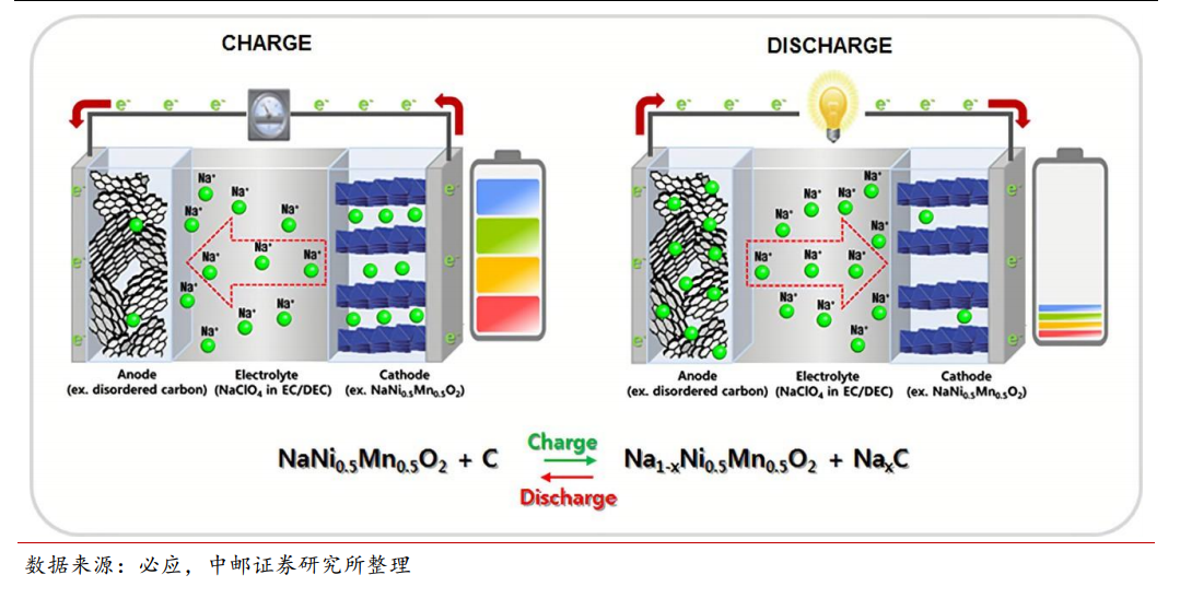 钠离子电池结构和原理类似锂电池。钠离子电池主要由两种不同的钠嵌入型材料(正极材料、负极材料)、电解液、隔膜等关键部件组成。充电时,钠离子从正极材料中脱出,经过电解液,隔膜,最后嵌入到负极材料;与此同时,电子经外电路从负极流向正极。放电过程则与充电过程相反。可以看出钠离子电池的工作原理和锂离子电池基本类似,也是一类 “摇椅式电池”。钠离子电池正、负极材料体系在电池产品中起决定性因素,电解液/隔膜主要与正、负极材料体系进行选择匹配使用,因此,正、负极材料体系也直接决定了电池最终的性能指标。