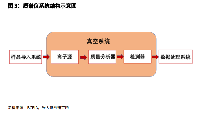 质谱仪器主要由五部分组成:样品导入系统、离子源、质量分析器、检测器、数据处理系统。样品导入系统通过合适的进样装置将样品引入并气化,气化后的样品引入到离子源进行电离-离子化过程,电离后的离子通过适量的加速后进入质量分析器,按不同的质荷比分离,数据处理系统对其进行分析,获得结果。质谱仪器中重要的两个部分是离子源和质量分析器。