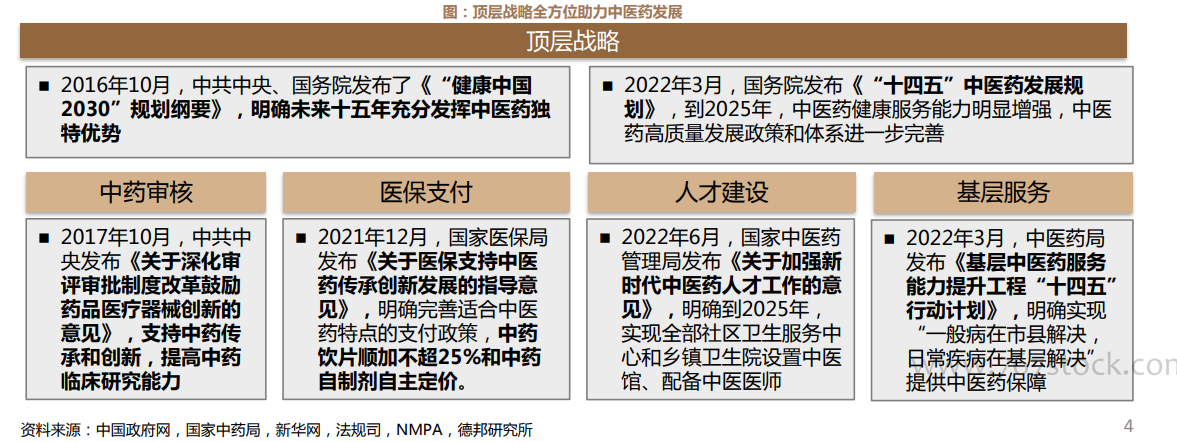 国家层面政策导向延续,围绕“十四五”规划、健康中国顶层战略颁布全方位配套政策。22年3月国务院发布《“十四五”中医药发展规划》,中药顶层设计已初步完善。近期,二十大会议顶层设计再次明确要“促进中医药传承发展”,会中提及中药;十四五中医药人才规划出台,看好近期医保谈判及未来可能的基药目录调整机会。