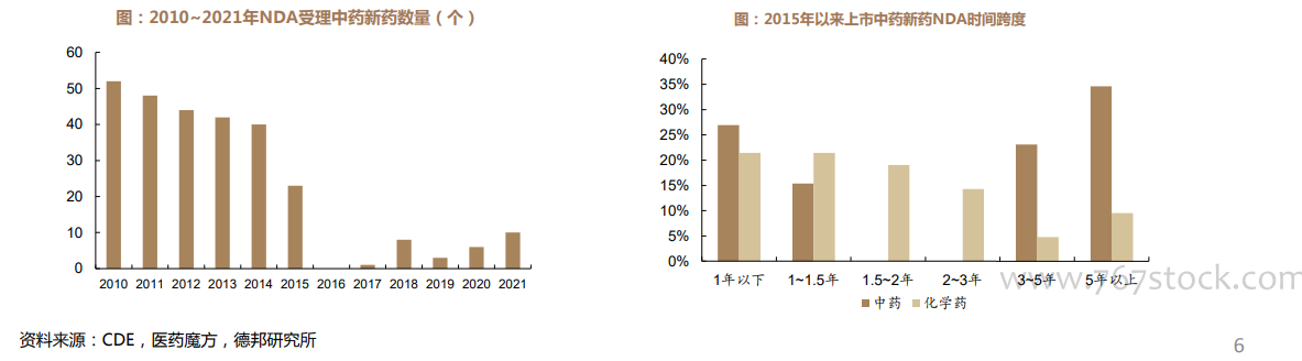 平均来看中药新药研发跨度比化学药长,但近两年审评速度加快。中药新药NDA时间超过3年的数量占比为58%,化学药仅为14%。临床研发耗时较长的中药新药递交IND时间大都在2005年前,递交NDA时间大都在2010年前后,可能是由于申报过程中补充资料的要求延长了审评时间;但由于药品研发规范化、审评资料标准化以及审评中心效率的快速提升,NDA时间在2年以下的中药新药大都为近几年递交上市申请的品种,中药审评已有所加速。