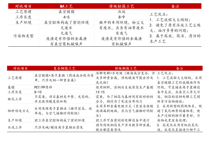 MC(PET铜箔)厚度6微米,其中PET基膜4微米,双面镀铜各1微米。同样可以起到提升电池能量密度、安全性、稳定性的功能。同时,由于铜的成本高,复合铜箔大规模量产后,有望具备成本优势。