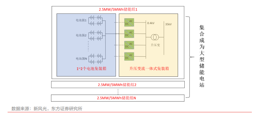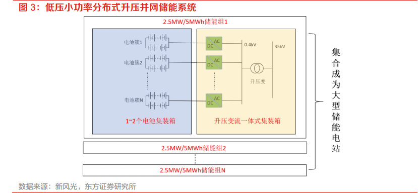 集中式:低压大功率升压式集中并网储能系统,电池多簇并联后与 PCS 相连,PCS 追求大功率、高效率,目前在推广 1500V 的方案。