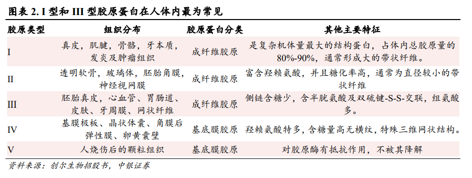 人体内拥有 28 种胶原蛋白,以Ⅰ型和Ⅲ型最为常见。人体内有 28 种胶原蛋白,分布于不同的部位,承担不同的功能。I 型胶原蛋白含量最高,占胶原总量的 80%-90%左右,主要存在于成人皮肤组织,骨骼和肌腱组织中,能有效改善皮肤凹陷、松弛和下垂等问题; III 型胶原蛋白在婴儿阶段占比较大,拥有抗衰功能,并且能为细胞提供营养物质,维持皮肤光滑弹性。
