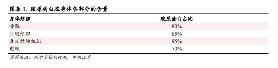 胶原蛋白是体内含量最多的蛋白质。胶原蛋白是人体内含量最多的蛋白质,其中 80%的胶原蛋白存在于骨骼之中,起到支撑器官和保护机体的功效。除此之外,在人体的皮肤、肌腱组织等机体内也有胶原蛋白分布,发挥着维持肌肤弹性,促进身体修复等方面的重要作用,是人体内重要的组织结构。