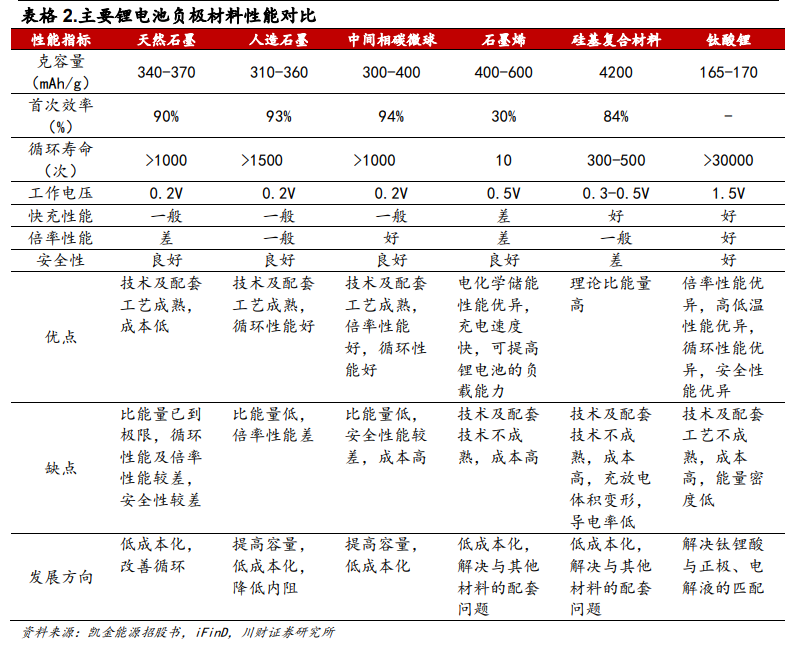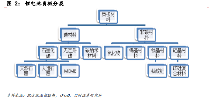 硅基负极材料属于目前各大负极材料厂商重点研究的对象,是未来最可能大规模应用的新型负极材料之一。人造石墨由石油焦、针状焦、沥青焦等原料通过粉碎、造粒、分级、高温石墨化加工等过程制成,优点为循环寿命长、极片膨胀小。天然石墨采用天然鳞片晶质石墨,经过粉碎、球化、分级、纯化、表面处理等工序制成,其克容量较高。非碳负极主要包括过渡金属氧化物、多元锂合金、锂金属氮化物和过渡金属氮化物、磷化物、硫化物、硅化物等等。尽管这些材料在某些方面比碳材料具有更大的优势,例如具有更高的比容量、更好的循环性能、更好的倍率性能等,但同时存在很多问题有待解决,例如充放电过程中的体积膨胀,电压滞后、安全性差等。目前最有可能率先取得突破的是硅材料,市场上已有相关应用,但其成本和售价高昂,性能有待进一步验证和评价,还没有大范围铺开。