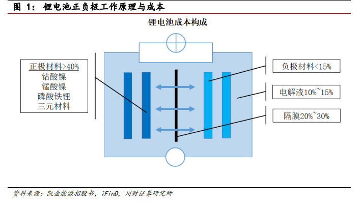 锂离子电池通常以碳材料为负极,以含锂的化合物为正极,在充放电过程中,没有金属锂存在,只有锂离子。当对电池进行充电时,电池的正极上有锂离子生成,生成的锂离子经过电解液运动到负极。作为负极的碳呈现层状结构,有很多微孔,到达负极的锂离子就嵌入到碳层的层状结构以及微孔中,嵌入的锂离子越多,充电容量越高。当对电池进行放电时(即使用电池的过程),嵌在负极碳层中的锂离子脱出,又运动回到正极,回到正极的锂离子越多,放电容量越高。锂离子电池主要由正极材料、负极材料、电解液和电池隔膜四部分组成。负极材料主要影响锂离子电池的首次效率、循环性能等,是锂离子电池最重要的原材料构成之一,占锂离子电池总成本的 10%左右,通常小于 15%。
