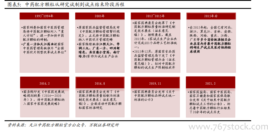 国内中药配方颗粒从开启研究试制阶段到目前已经历经30余年,经历了探索阶段、试点阶段到现在的后试点阶段。1993年,国家科委和国家中医药管理局将中药配方颗粒列入“星火计划”, 1994年3月,国家中医药管理局批准广东一方和天江药业为“全国中药饮片剂型改革试点单位”; 2001年4月,《中药配方颗粒管理暂行规定》颁布,之后陆续批准企业试点生产中药配方颗粒;2015年12月,原国家食品药品监督管理总局下发了《中药配方颗粒管理办法(征求意见稿)》,拟对中药配方颗粒的试点生产限制性放开,之后各省份批准相关企业在省内开展中药配方颗粒科研生产试点及医疗机构临床使用;2016年2月26日,国务院又印发了《中医药发展战略规划纲要(2016-2030年)》,明确将中药配方颗粒纳入国家中医药发展战略规划内容之中。