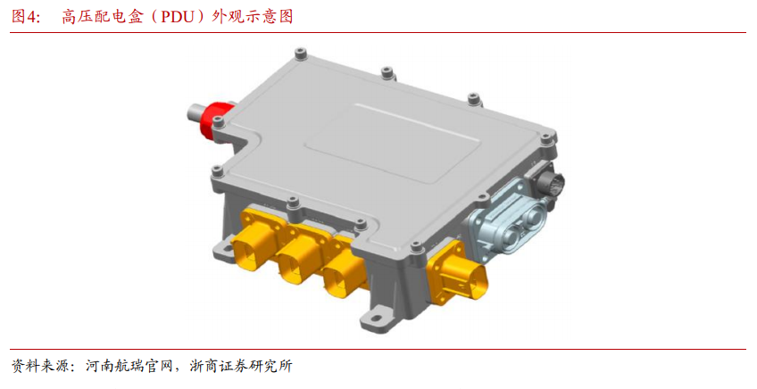 高压配电盒(PDU)对整车高压电管理,将电能传送到电机、空调、加热器等设备。PDU 是电动汽车电能分配单元,通过母排及线束连接高压元器件,起到高压系统充放电控制、高压部件的电控制、电路过载短路保护、高压采样、低压控制等功能,并起到保护和监控高压系统的运行的作用。